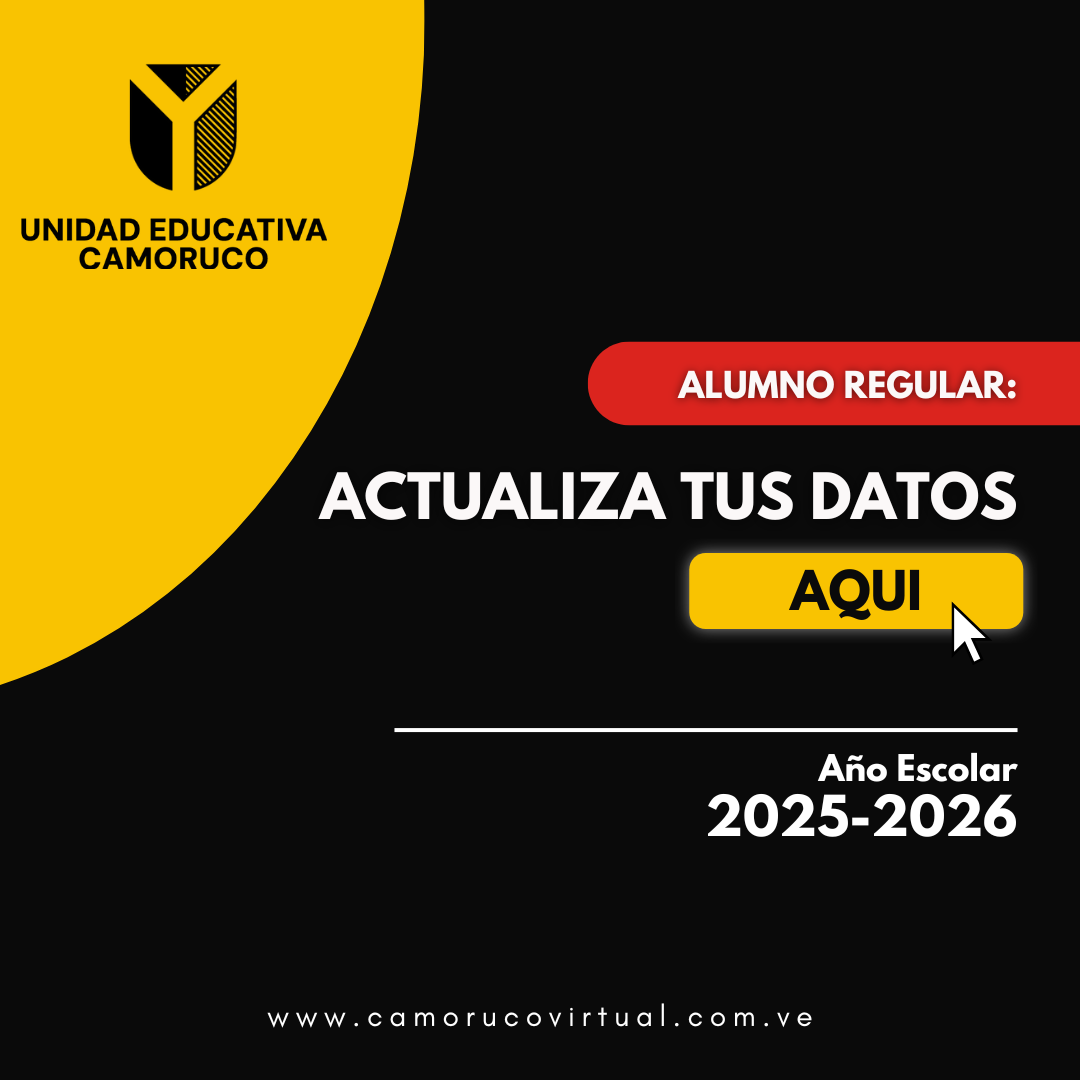 PREINSCRIPCIONES Y SOLICITUD DE CUPO AÑO ESCOLAR 2025-2026 Ingresa para iniciar el proceso de admisión de alumnos nuevos para el año escolar 2025-2026 CONTACTO | RECLAMOS | SUGERENCIAS Ubicación / Formulario de contacto / Correo / Teléfonos / Reclamos / Sugerencias. CLUB DEPORTIVO Baloncesto / Fútbol Sala / Fútbol campo / Ajedrez / Tenis de Mesa / Taewon Do / Karate Do CAPELLANÍA Información sobre la capellanía de la U.E. Camoruco APROVECHA EL PRONTO PAGO Reporte su pago AquíYa está disponible el módulo para que usted pueda reportar sus pagos. ¡UNETE A LA FAMILIA CAMORUCO! Envía tu resumen curricular a:[email protected] Compartir esta página